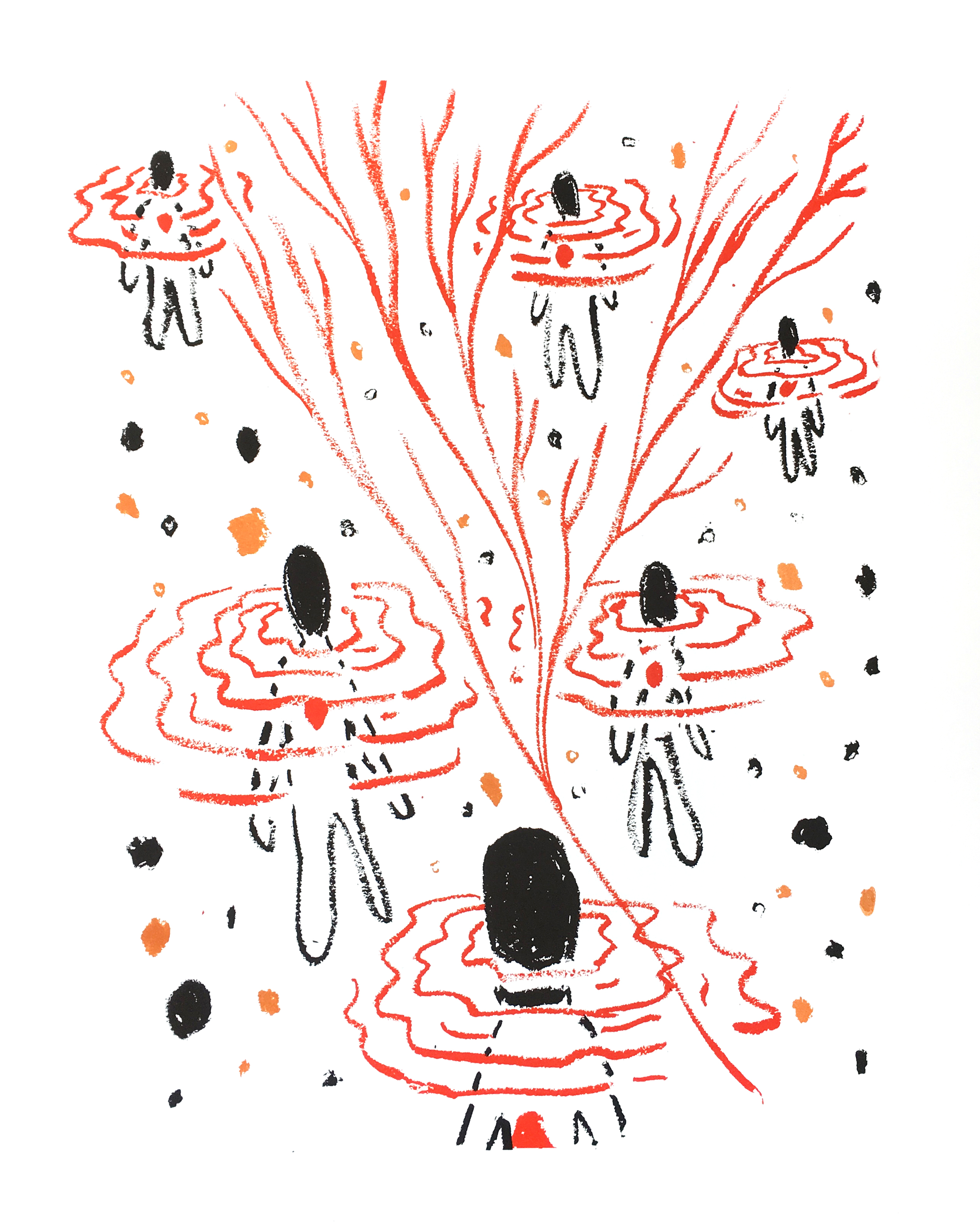 The artwork on this website spans drawings, silkscreens, paintings, mixed media, writing, and digital art—all part of Branching Wave, an ongoing world-building project.